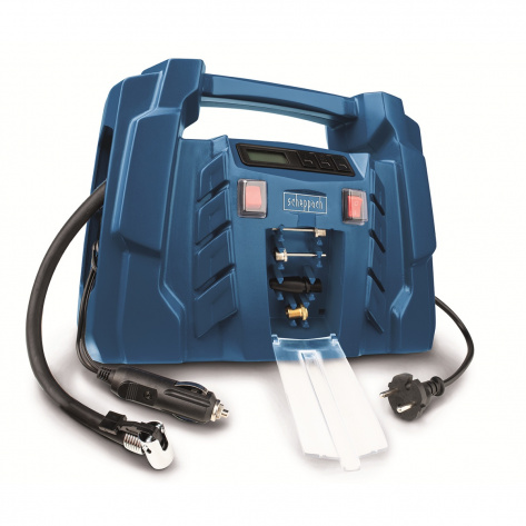 Kompresor Scheppach AIR FORCE 5 je malý, ale užitečný pomocník, kterého můžete napájet jak z běžné sítě na 230 V, tak i z běžné automobilové zásuvky na 12 V. Uplatní se tak nejenom jako praktický, skladný, a lehký kompresor ve vaší dílně nebo garáži, ale využijete ho i na cestách v autě nebo karavanu. Obsluha je velmi jednoduchá. Na digitálním displeji vidíte aktuální hodnotu tlaku. Ten si jde rovněž v rozmezí 0,1 až 8 bar předvolit a po dosažení nastaveného tlaku se kompresor automaticky vypne. Díky velkému množství různých koncovek a maximálnímu tlaku až 8 barů si hravě poradí s foukáním pneumatik motocyklů, kol, aut, terénních čtyřkolek, míčů, matrací, nafukovacích člunů, raftů apod. Veškeré příslušenství, včetně dvou elektrických kabelů, tlakové hadice 0,6 m a čtyř různých koncovek je chytře ukryto uvnitř kompresoru, takže se Vám nic neztratí. Pohodlné madlo usnadní přenášení. Kompresor je vybavený nejmodernějším motorem s bezolejovou technologií. Kontrola oleje, jeho doplňování nebo výměna tak vůbec není potřeba a kompresor je tak vždy připravený odvést svoji práci. Jeho rozměry a váha pouhých 1,9 kg ho rovněž předurčují k využití při stanování, kempování a jiných outdoorových aktivitách.
