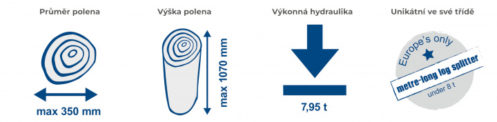 V kategorii do osmi tun se jedná o jediný štípač, který může štípat i metrová polena. Nejmodernější motor postavený na principu bezuhlíkové technologie má mnohem vyšší účinnost než běžné elektromotory, šetří elektrickou energii a je téměř bezúdržbový. Robustní podvozek se dvěma koly umožňuje pohodlné přemísťování stroje. Celá konstrukce štípače je vyrobena z jakostní oceli ošetřené kvalitním práškovým nátěrem a celkově je stroj navržen s ohledem na co nejdelší životnost.