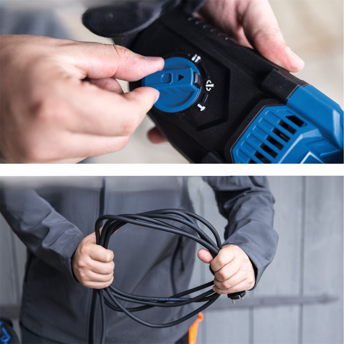 Srdcem stroje je výkonný elektromotor o příkonu 1 050 W, který zajišťuje spolehlivý chod a dostatek síly i při náročnějším použití. Plynulá regulace otáček v rozsahu 0–1 230 ot./min umožňuje přesnou kontrolu nad prací a přizpůsobení aktuálnímu materiálu. Přepínání mezi jednotlivými režimy je rychlé a pohodlné díky praktickému voliči, a to bez nutnosti použití nářadí.