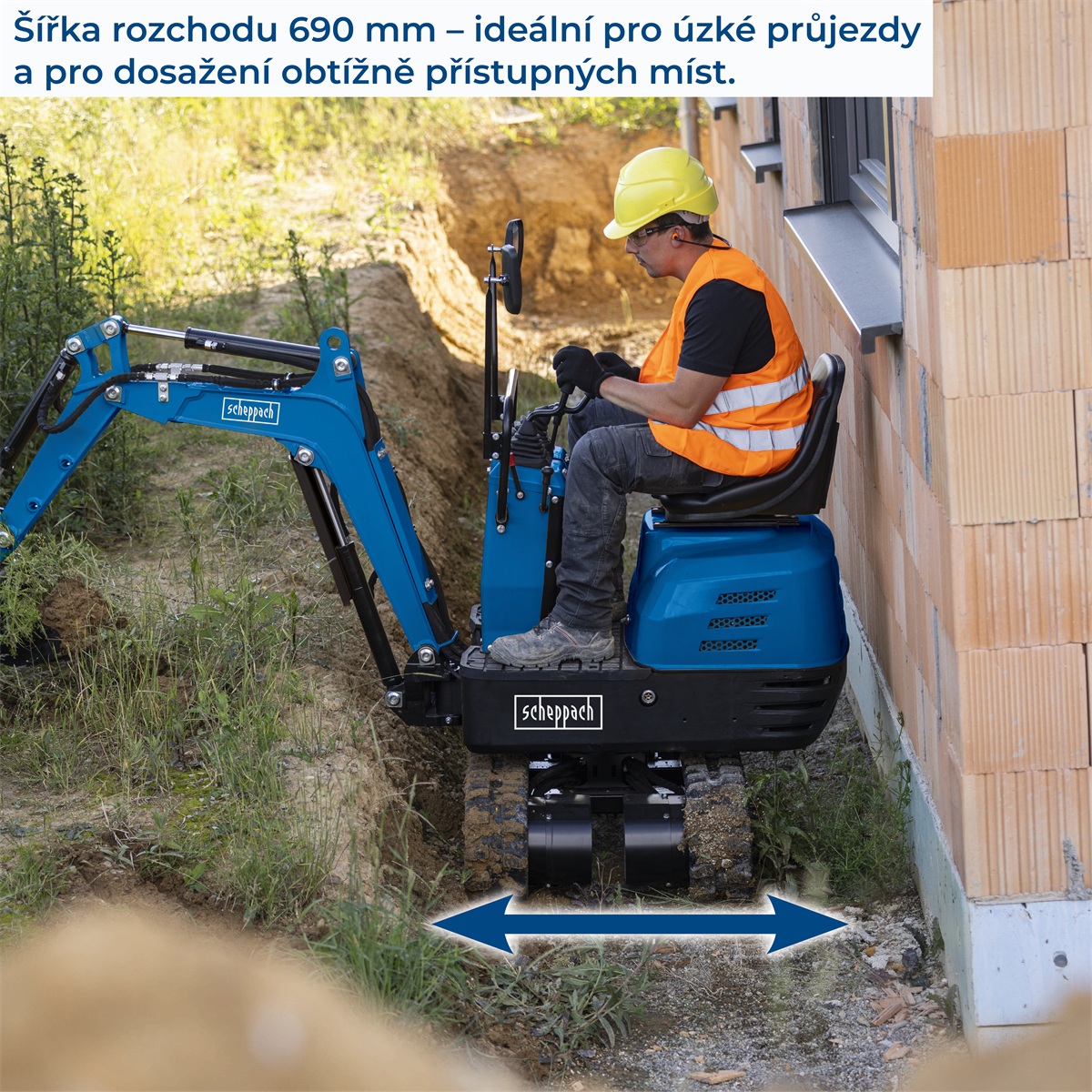 Tento kompaktní mini bagr s provozní hmotností 563,5 kg a schopností mimoosého kopání je ideálním pomocníkem pro širokou škálu výkopových prací, údržbě zahrad, vyrovnávání půdy, nakládání a vykládání materiálů na vozidlo apod. Díky své štíhlé konstrukci s rozchodem pásů pouhých 690 mm se snadno dostane i do úzkých průchodů a stísněných prostor.