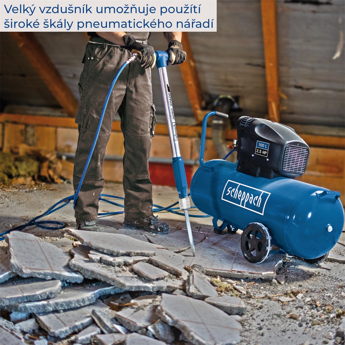 Kompresor Scheppach HC 120 DC je skvělým řešením pro velmi náročné uživatele. Díky tlaku až 10 bar a velkému obsahu vzdušníku 100 l se hodí hlavně tam, kde je potřebná dostatečná zásoba tlakového vzduchu, například k pohonu široké škály pneumatických nástrojů, jako jsou vrtačky, rázové utahováky, sponkovačky, stříkací pistole a podobně. Pro snadnou výměnu nástrojů jsou oba výstupy opatřeny rychlospojkami. O rychlé natlakování a vysoký sací výkon 412 l/min. se stará výkonná dvouválcová jednotka o výkonu 3 PS. Ta je mazána olejem a díky dvouválcové technologii se vyznačuje velmi dlouhou životností. Snadnou manipulaci se strojem zajišťuje velké madlo a vzduchem plněné pneumatiky.