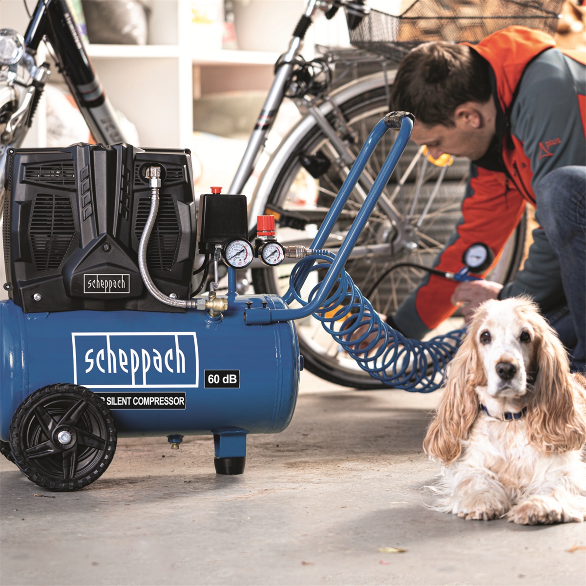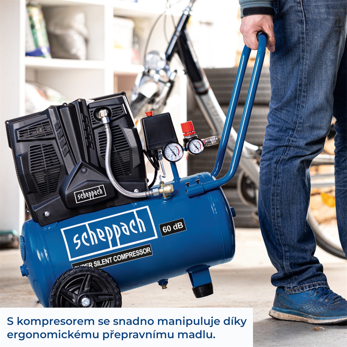 Kompresor Scheppach HC 25 Si je tichý bezolejový dvouválcový kompresor, který je vhodný i do míst a provozů s vysokými požadavky na nízkou míru hluku. Hlučnost 60 dB (A) znamená hladinu hluku zhruba na úrovni bublání varné konvice, takže v praxi budete vnímat hluk tohoto kompresoru pouze minimálně. Další výhodou je bezolejová technologie, která znamená, že do vzdušníku ani dále do spotřebiče vzduchu, neunikají žádné olejové páry. To se hodí v potravinářství, u speciálních lakýrnických prací nebo třeba při tlakování výčepních zařízení. Bezolejová technologie znamená rovněž mnohem nižší nároky na údržbu celého stroje. Scheppach rovněž odstranil běžnou nevýhodu tichých kompresorů, a to poměrně nízký sací výkon. Díky nové technologii je sací výkon 230 l/min téměř dvakrát vyšší, než je běžné a je plně srovnatelný s klasickými kompresory. Vzdušník o objemu 24 l slouží jako zásobárna stlačeného vzduchu a motor se tak automaticky zapíná jen v případě, že tlak vzduchu klesne pod požadovanou úroveň. Vzdušník rovněž výrazně rozšiřuje možnosti kompresoru a stroj se tak stává opravdu multifunkčním pomocníkem. Díky němu můžete s kompresorem, mimo běžného huštění a ofukování, provádět i náročnější operace s použitím různých druhů pneumatického nářadí. Kompresor je vybaven manometrem vzdušníku i manometrem pro kontrolu pracovního tlaku. Přídavné madlo a kolečka umožní snadnou manipulaci se strojem, antivibrační podstavec zase zajistí klidný chod stroje.