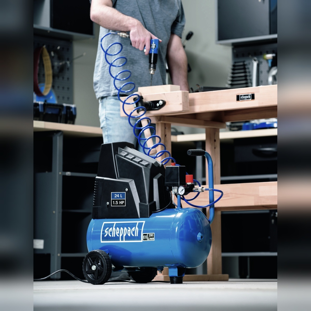 Kompresor Scheppach HC 30 OX je ideálním pomocníkem do každé domácnosti. Je neuvěřitelně snadný na údržbu. Jednak má moderní pumpu s bezolejovou technologií, takže se nikdy nemusíte starat o správnou hladinu oleje a jednak má nejmodernější technologii indukčního (bezuhlíkového) motoru. Takový motor je rovněž v podstatě bezúdržbový a díky menšímu počtu pohyblivých částí a mnohem menšímu počtu třecích ploch je jeho životnost několikanásobně delší než u klasického komutátorového motoru. Navíc je i výrazně tišší. Vzdušník slouží jako zásobárna stlačeného vzduchu a motor se tak zapíná jen v případě, že tlak vzduchu klesne pod požadovanou úroveň. Díky vzdušníku můžete s kompresorem provádět i náročnější operace, než je běžné huštění či ofukování. Můžete k němu připojit sponkovačku, mycí pistoli nebo zvládne i méně náročné stříkací práce s barvou či dalšími pneumatickými nástroji. Při dofukování pneumatik zase oceníte jednoduché nastavení výše tlaku, který můžete snadno kontrolovat pomocí vestavěného manometru. Díky bezolejové technologii se výborně hodí i k udržování tlaku v pivních sudech. Přídavná rukojeť a kolečka umožní snadnou manipulaci se strojem.