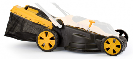 Spolehlivý střih trávy obstarává široký tvarovaný žací nůž se záběrem 38 cm. Sekačka podporuje systém 2v1. Máte tedy možnost využít funkci zadního výhozu nebo sběru do velkého 40 litrového plastového koše.
