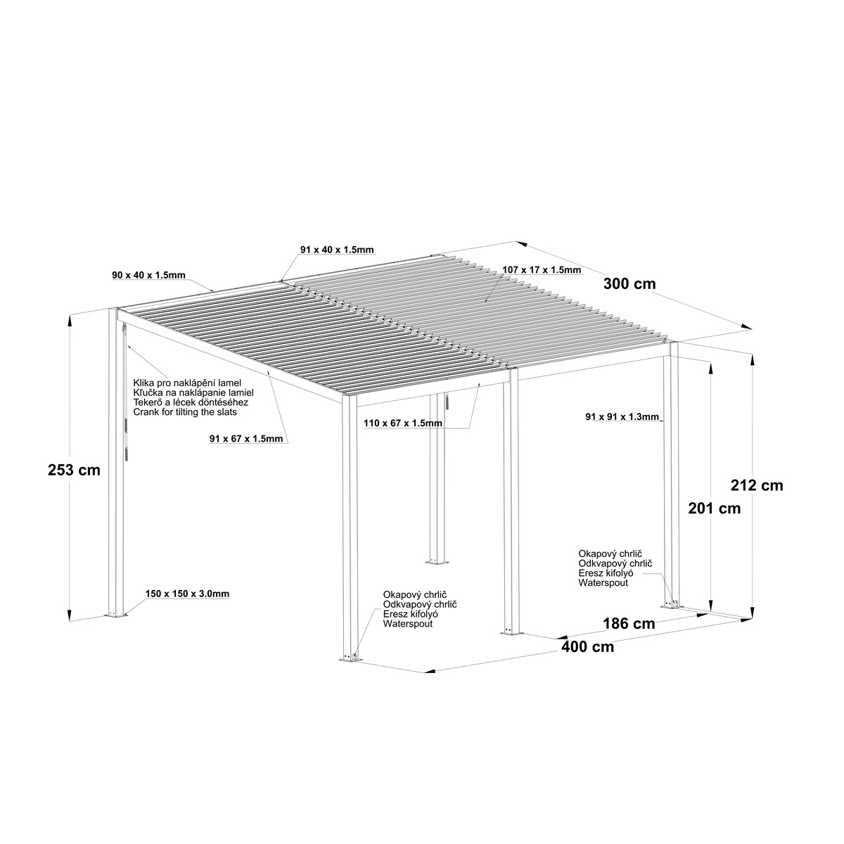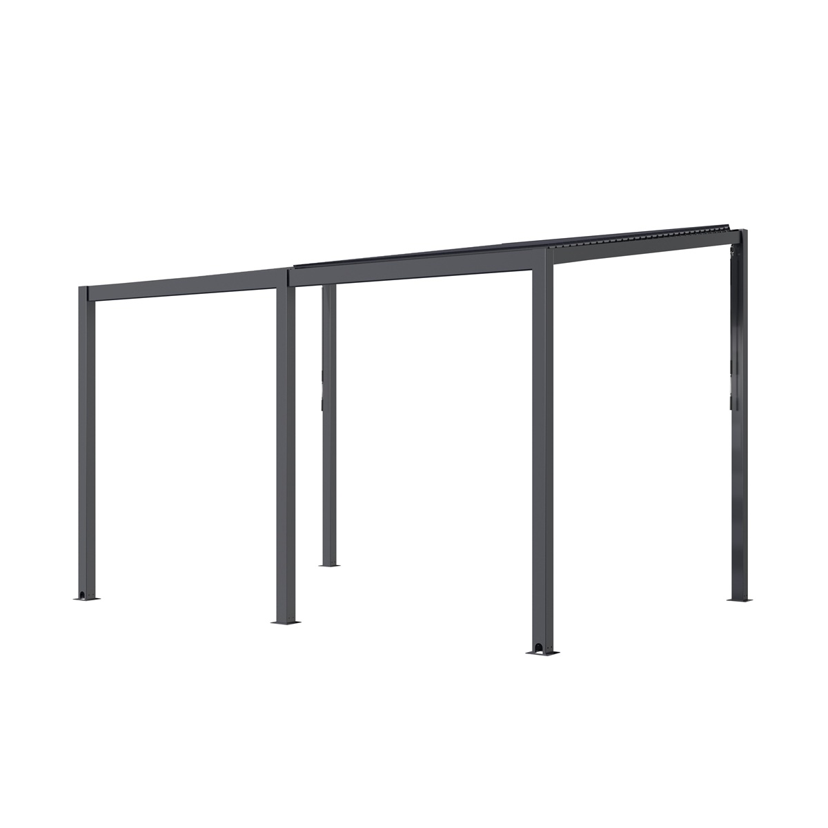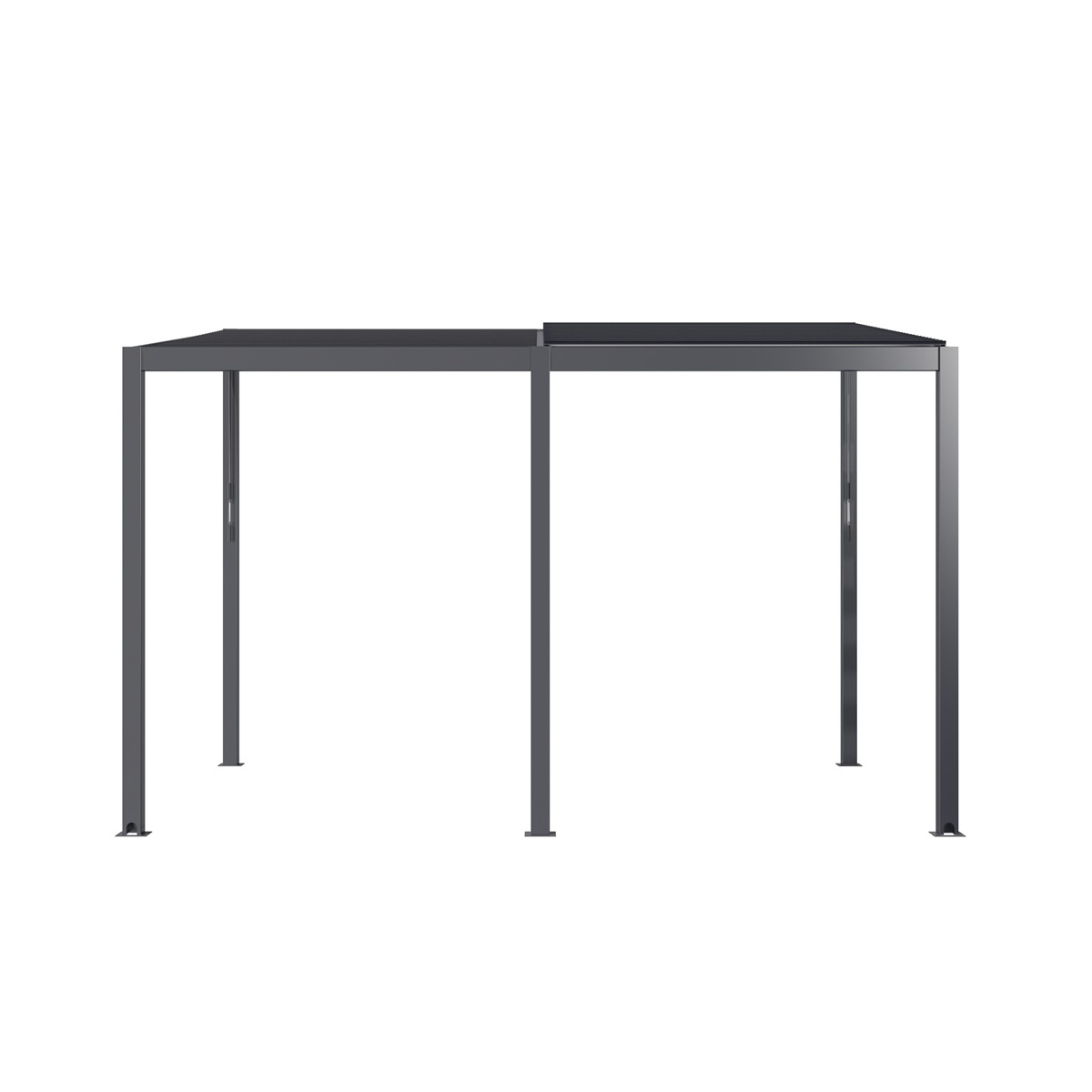 RMBP 13 x 10 Anthracite Moderní bioklimatická pergola RMBP 13 x 10 v elegantním antracitovém provedení je ideálním řešením pro stylové a funkční zastřešení venkovního posezení. Nabízí variabilní systém zastínění, který umožňuje regulovat množství světla i proudění vzduchu, takže si můžete naplno užívat pobyt venku v jakémkoliv počasí. Pergola má celkové rozměry 400 × 300 × 251 cm, což poskytuje dostatek prostoru pro pohodlné posezení i větší zahradní nábytek.