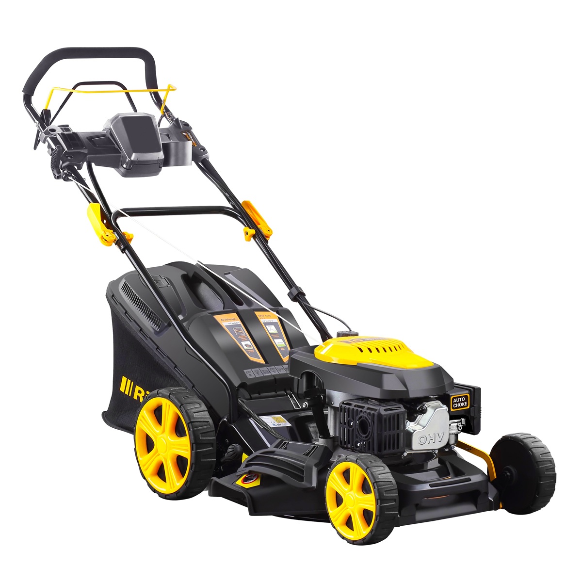 Riwall PRO RPM 4735 E multifunkční travní sekačka 4 v 1 s benzinovým motorem, pojezdem a elektrostartem
