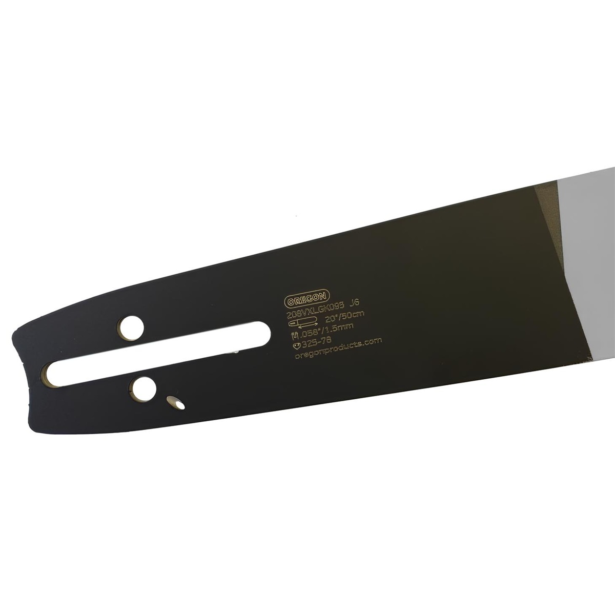 Vodící pilová lišta Oregon o délce 20 palců (50 cm) a šířkou drážky 1,5 mm. Pro řetězy s roztečí .325".