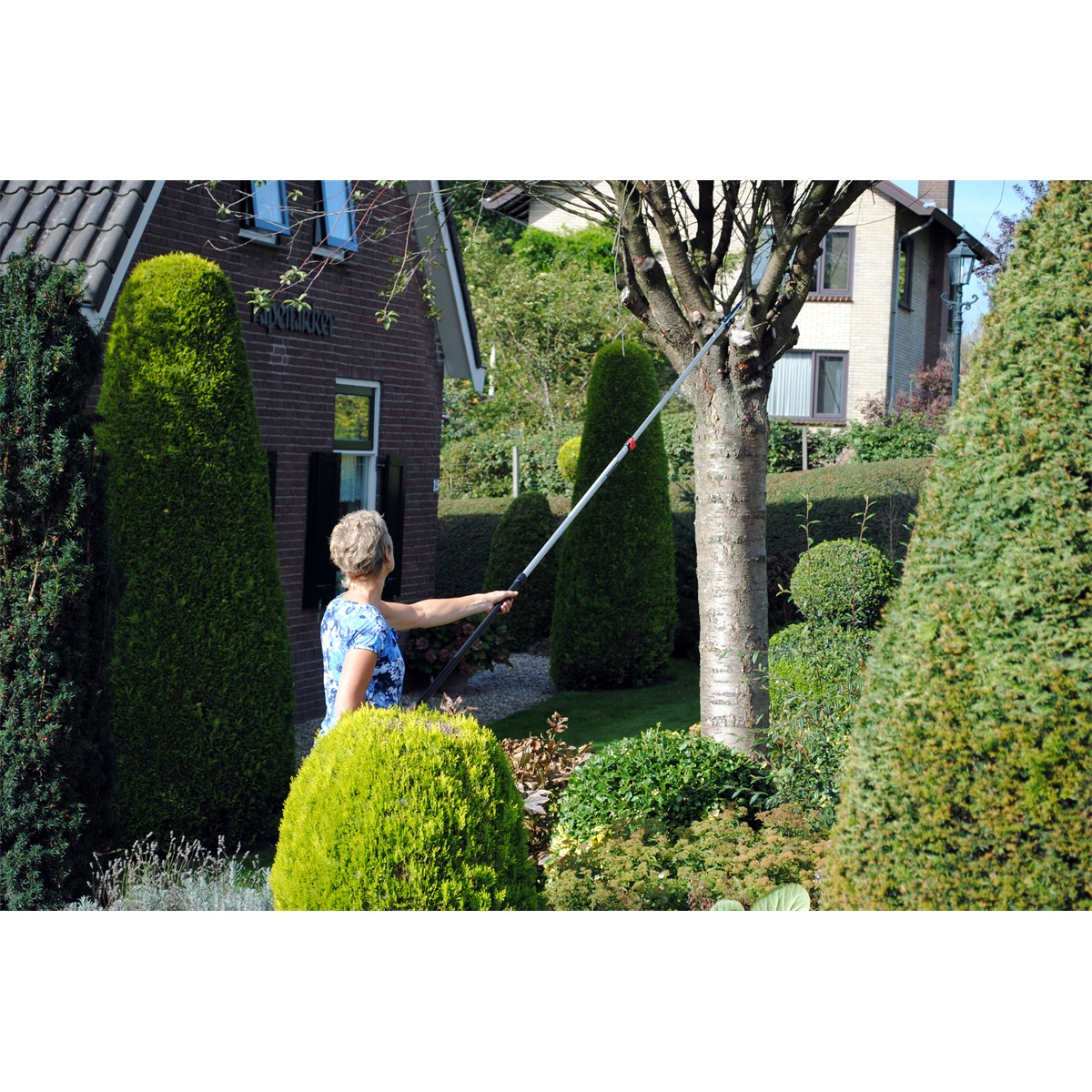 Hliníková násada má oválný tvar, díky které máte velmi přesnou kontrolu nad směrem řezu, což budete potřebovat při prořezávání ve velké výšce. Navíc tento tvar poskytuje větší pevnost a tuhost po celé délce tyčové pily a minimalizuje ohýbání. Při plném rozložení násady pak pila dosahuje maximální délky 3,3 metru. V kompletně složeném stavu má pila naopak pouhých 2 m, což oceníte při jejím transportu. Dva zajišťovací mechanismy (tlačítka a páky) společně vytvářejí nejbezpečnější a nejstabilnější zajištění preferované délky násady, přičemž nejnižší část je opatřena gumou rukojetí pro pohodlné a bezpečné uchopení i za mokra.